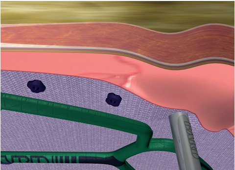 • Nach der Positionierung mit dem Echo PS™ Positionierungssystem bleibt das Netz in Position, sodass der Chirurg beide Hände zur Fixation verwenden kann.