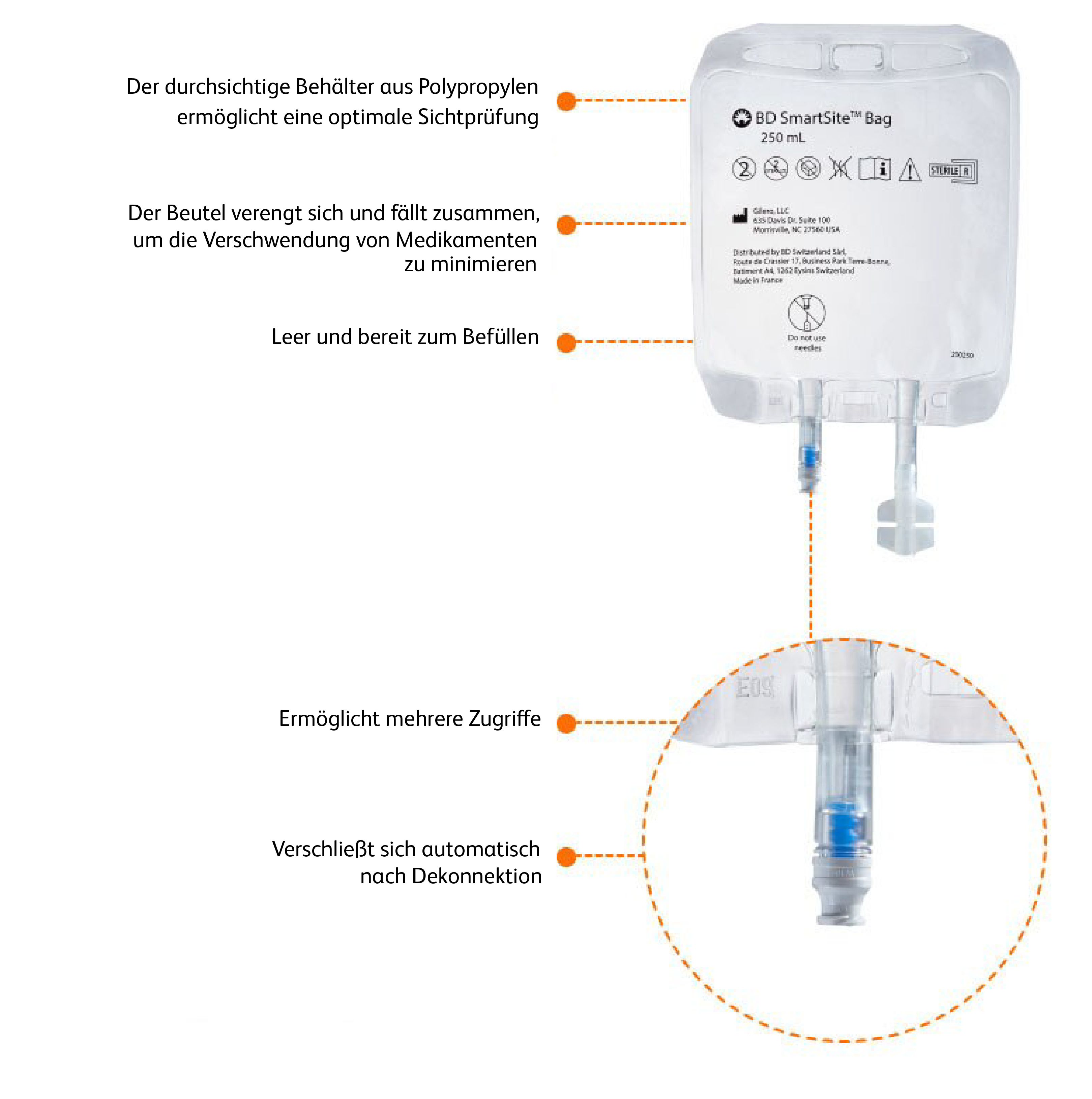 Verabreichung der Infusionslösung im SmartSite™ Bag Infusionsbeutel durch den nadelfreien Zugang: