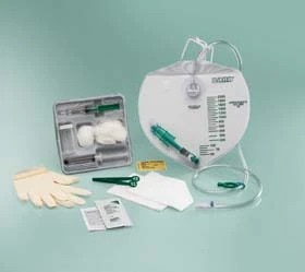 This tray is available with a silicone catheter. Catheter is pre-connected to a drain bag and comes with components to catheterize a patient.