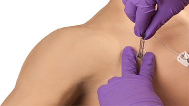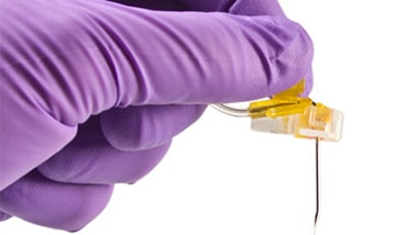 The MiniLoc™ Safety Infusion Set's low profile and small footprint design make it the optimal needle for dressing the access site. The small size of the needle and the downward angle of the tubing coming off of the back of the device help to maintain dressing integrity.