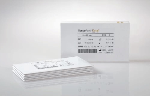 TissuePatchDural™ is a self-adhesive film indicated for use to seal and reinforce against fluid (including CSF) and/or blood leakage, where repair of the dura mater is required.1