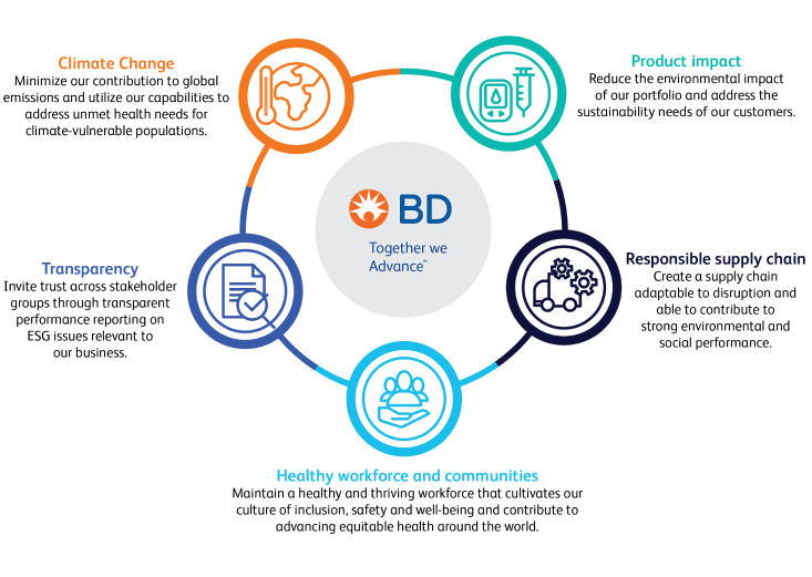 At BD, we’re Advancing the World of Health. This purpose drives our business and guides our approach to responsibly engage in important issues that impact our sustainable business strategy. Through our corporate sustainability strategy – Together We Advance – we embrace the connectivity between the health of our company, the planet, our communities and the people we serve to realize a healthy, equitable and resilient world for all.