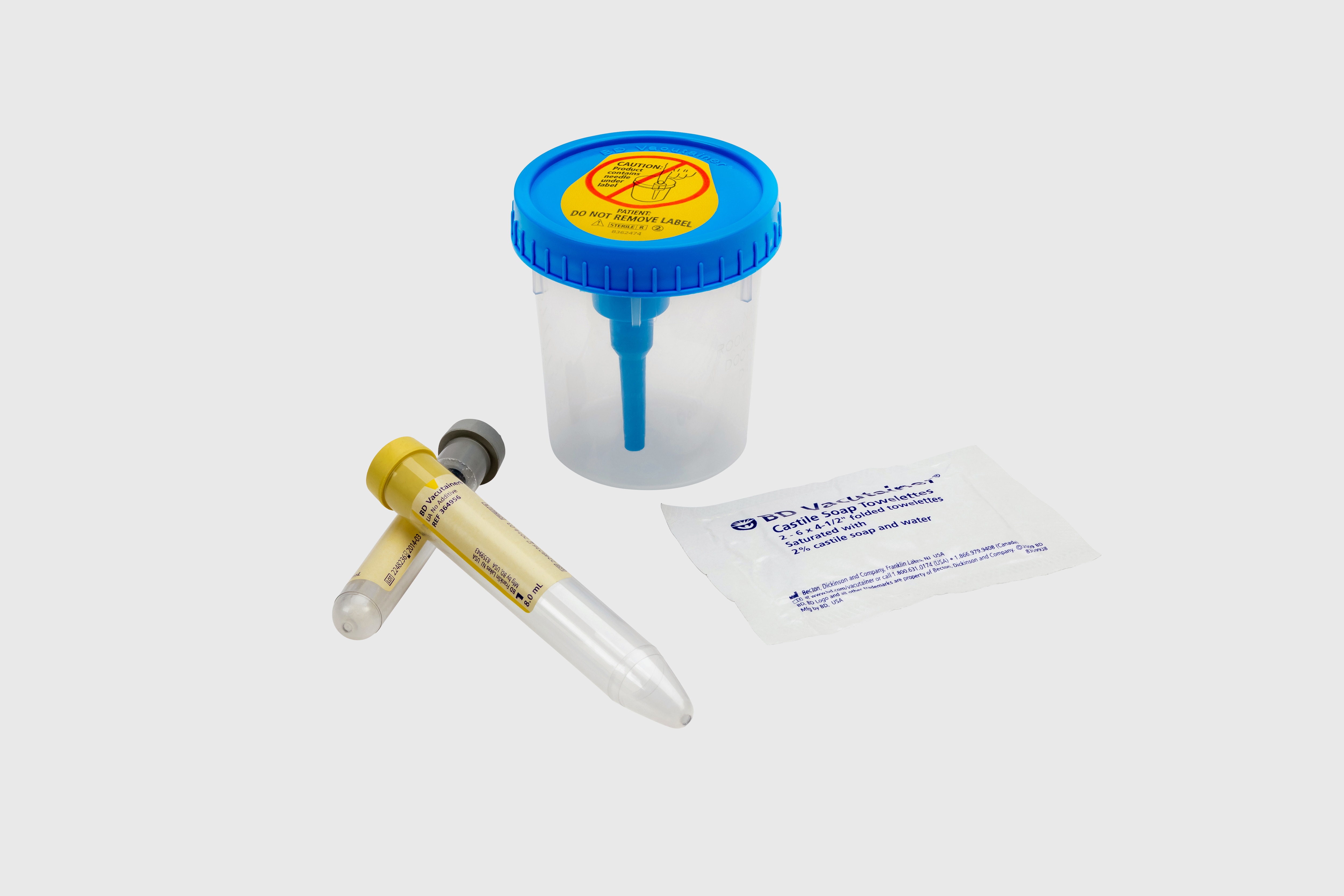 This kit includes a castile soap wipe, BD Vacutainer® Urine Collection Cup with integrated transfer device, BD Vacutainer® C&S Preservative 4.0 mL round bottom tube, BD Vacutainer® Urinalysis Preservative 8.0 mL round bottom tube, and BD Vacutainer® No Additive (Z) Discard Tube 6.0 mL round bottom tube.