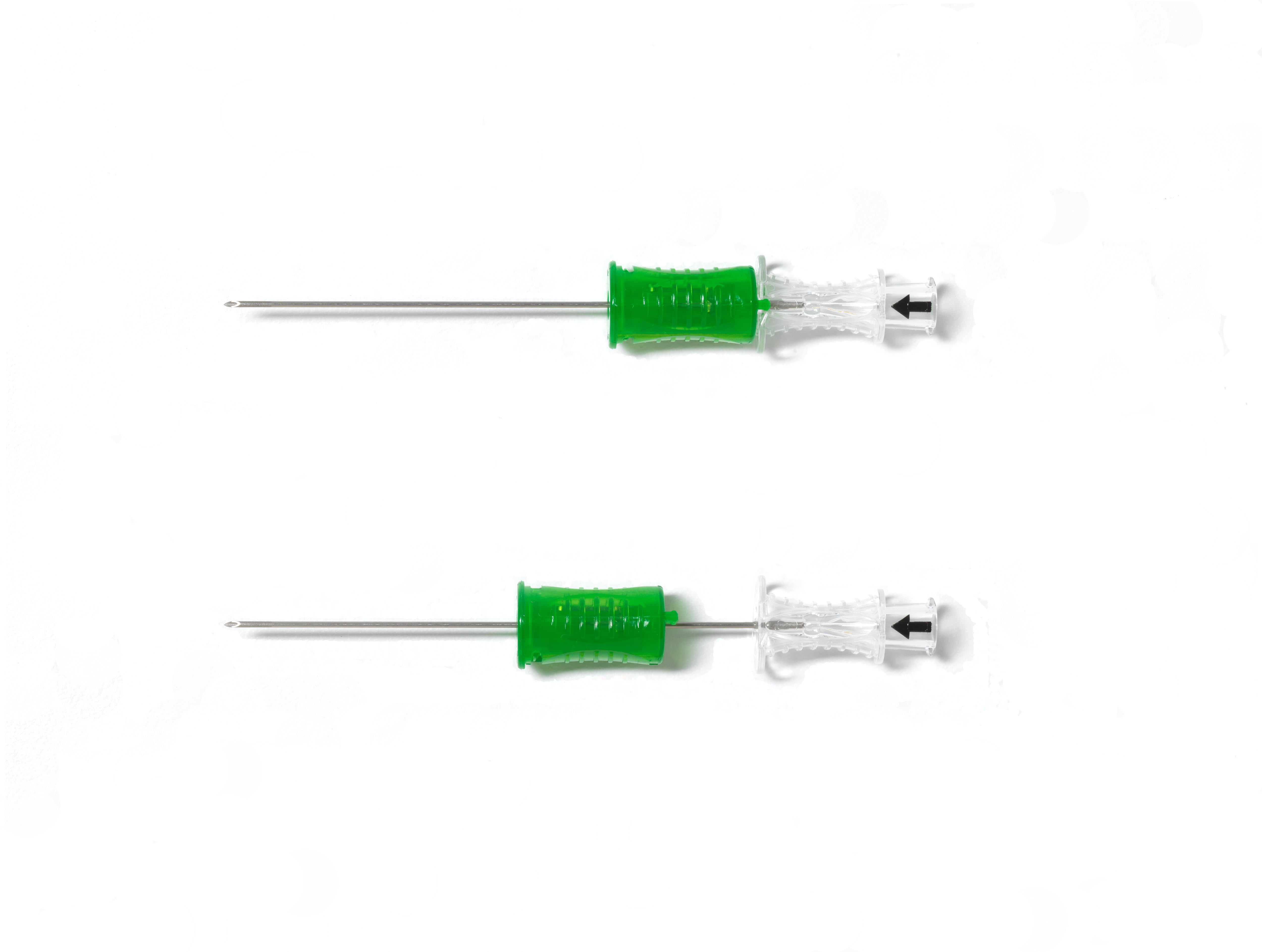 The SecureLoc™ Safety Introducer Needle is an echogenic needle that features a 12-degree bevel angle and is compatible with the Pinpoint™ Needle Guide. A manually activated integral safety guard reduces the risk of accidental needlestick injuries by shielding the needle sharp after use.