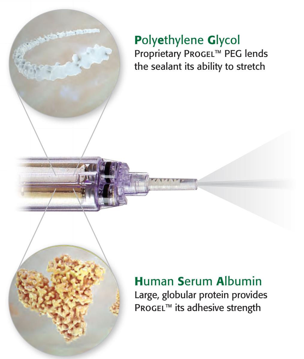 Progel™ Pleural Air Leak Sealant is a single use device intended for application to visceral pleura after standard visceral pleural closure with, for example, sutures or staples, of visible air leaks incurred during resection of lung parenchyma.