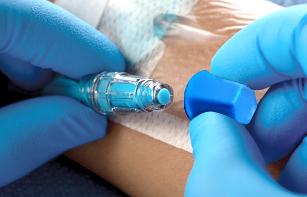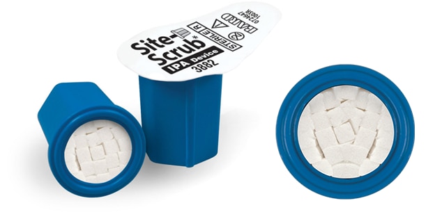 The BD Site-Scrub™ IPA Device is an active disinfecting device intended for use on injection ports and female luer hubs. It is designed with patented “foam fingers” containing 70% isopropyl alcohol (IPA) solution which provide active friction scrubbing to surfaces of the luer.