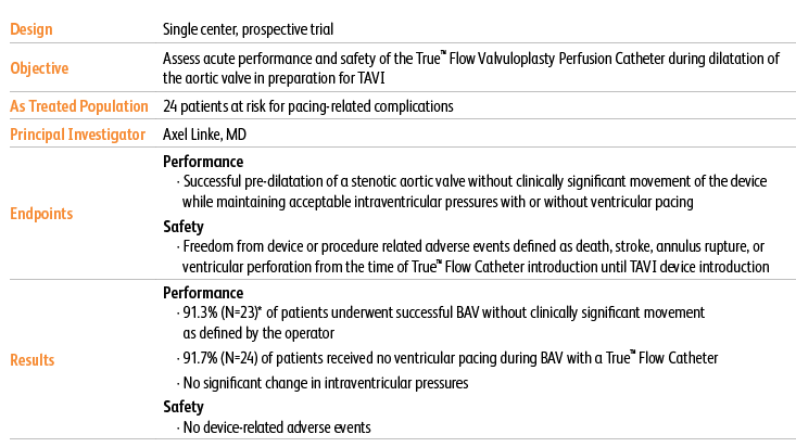 The True™ Flow Valvuloplasty Perfusion Catheter is indicated for balloon aortic valvuloplasty.