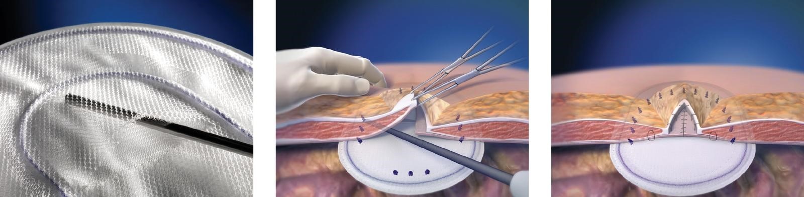 3. Do not cut or reshape the Ventrio™ Hernia Patch, as this could affect its effectiveness. Care should be taken not to cut or nick the SorbaFlex™ PDO monofilament during insertion or fixation. If the SorbaFlex™ PDO monofilament is cut or damaged, the mesh must be removed immediately. Additional complications may include, but are not limited to, bowel or skin perforation and infection.