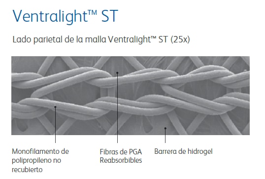 La malla Ventralight™ ST está indicada para utilizarse en la reconstrucción de deficiencias de tejido blando durante la reparación de hernias abdominales, incisionales y umbilicales.