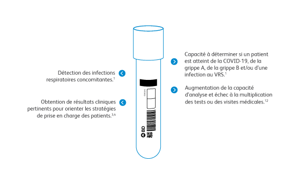Grâce au panel de virus respiratoires BD pour le système BD MAX™ Instrument, vous pouvez détecter et différencier simultanément le SARS-CoV-2, le virus de la grippe A, le virus de la grippe B ou le VRS à partir d’un échantillon en une seule analyse. Le test utilise un seul écouvillon nasal ou un seul échantillon d’écouvillon nasopharyngé pour déterminer si un patient a la COVID-19, la grippe ou un VRS. Il permet d’éliminer la nécessité de plusieurs tests ou visites chez le médecin et peut aider les cliniciens à mettre en œuvre rapidement le bon plan de traitement. La combinaison de tests permet également d’augmenter la capacité de tests pendant la saison de la grippe et d’accélérer le délai de diagnostic.