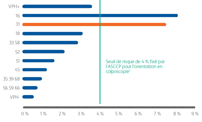 Un examen systématique de 16 études montre que le VPH 31 présente un risque similaire ou plus élevé de développer la maladie CIN3+ par rapport au VPH 18, supérieur au risque immédiat de 4 % du seuil du CIN3+ de l’ASCCP pour une orientation vers la colposcopie.4,5