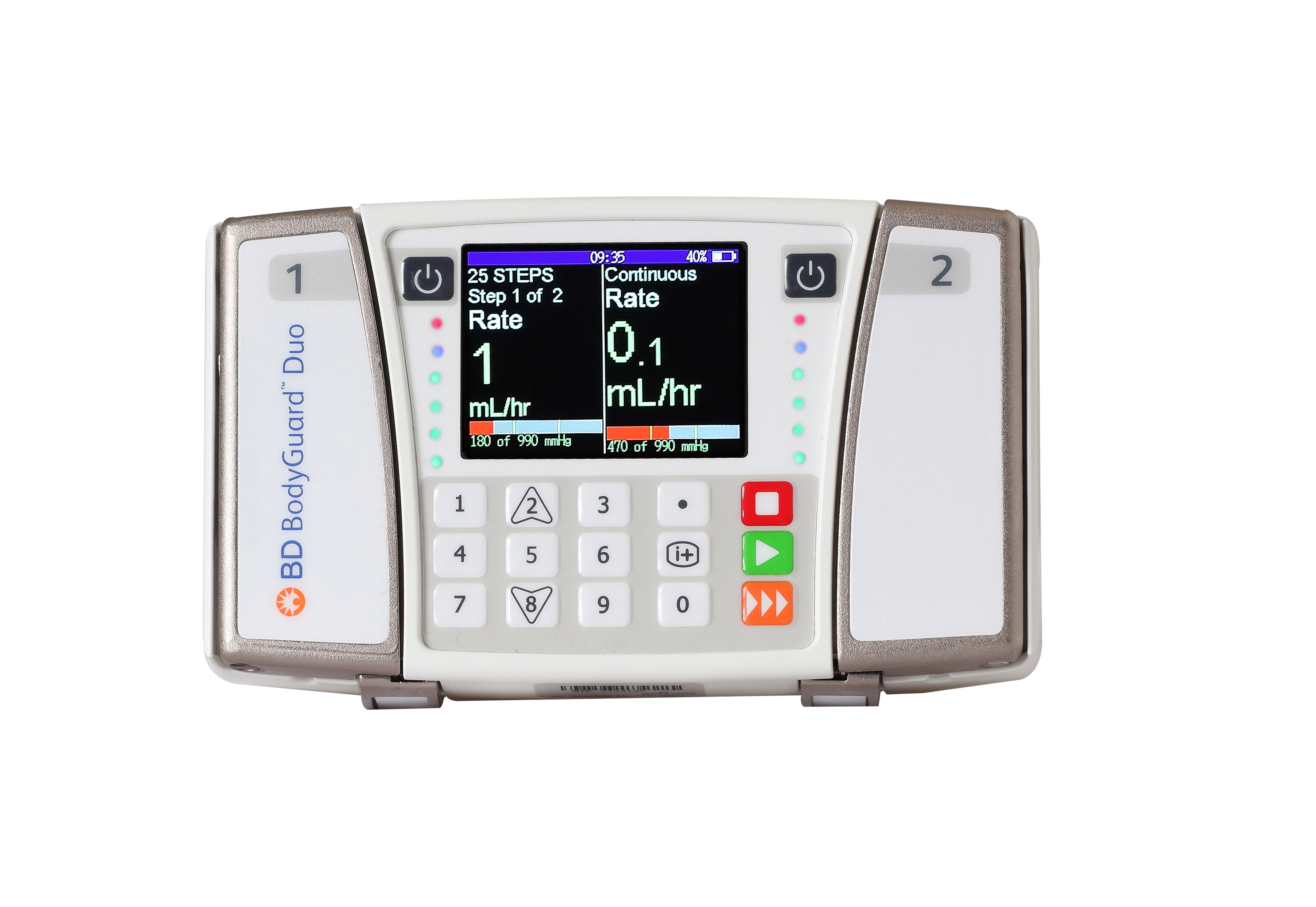 Con 2 canali di infusione, un'unica interfaccia utente semplificata e una reale capacità di flusso simultaneo, il sistema infusionaleBD BodyGuard ™Duo risponde alle esigenze di ambienti di infusione multicanale ad alta intensità, come l'oncologia medica ambulatoriale, il trasporto di pazienti e la terapia infusionale generale. I sistemi BDBodyGuard™ Duo e MicroSet BDBodyGuard™ offrono flessibilità e convenienza sia ai professionisti sanitari che ai pazienti, liberando del tempo agli infermieri, aiutando ad assicurare l'aderenza ai protocolli farmaceutici, migliorando l'efficienza del flusso di lavoro e riducendo il costo e l'impatto dell'apparecchiatura.