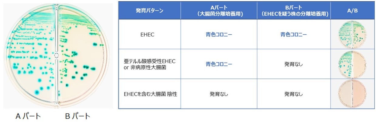 EHECクリアーHTシステム寒天培地は、1枚のシャーレに2種類の培地が組み合わされている培地です。これらの組み合わせにより、EHECの疑いのある株を分離すると同時に、これまで分離が難しく見落とされていた亜テルル酸感受性EHECの可能性のある株も含めて、一度の培養検査で分離することを可能にしました。