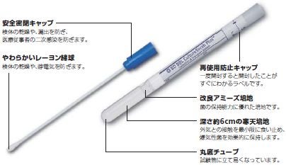 酸化還元電位を低く保つ改良型アミーズ培地の使用で嫌気性菌を保護するとともに、栄養要求の厳しい菌も、継続的に保持します。また、砂時計型チューブと、寒天の加えられた深さ約6cmの培地が外気との接触を最小限にとどめ、嫌気性菌を適切に保持します。スワブ先端部には、検体採取に最適な柔らかいレーヨン繊維を採用しています。