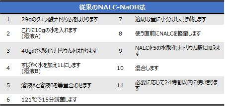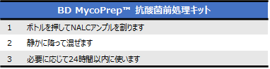 NALC(N-アセチル-L-システイン)の入ったアンプルを割り静かに混ぜるだけで、NALC処理液が調製でき、この処理液は24時間使用することが出来ます。
