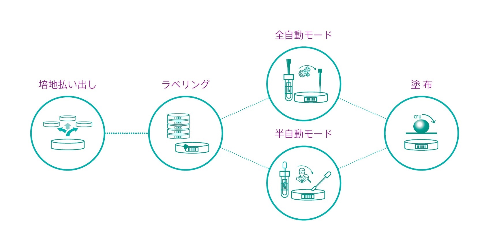 検体の性状、容器に関わらず処理ができます。また、安全キャビネットやグラム染色スライド作成機能をオプション追加することでさらに効率化・安全性の向上が図れます。