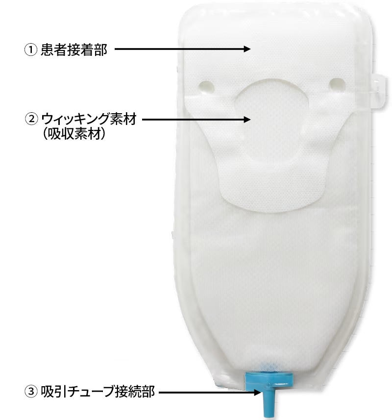 外装内の吸収素材部が排尿された尿を吸収し、患者さんの皮膚を保護するよう設計されています。