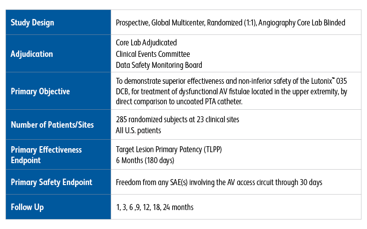 Lutonix® 카테터는 경피적 혈관성형술(PTA)에 사용되며, 사전 확장 후 직경 4mm~12mm, 길이 최대 150mm의 기능 장애 원발 동정맥 투석 누공의 협착 병변을 치료하는 데 사용됩니다.