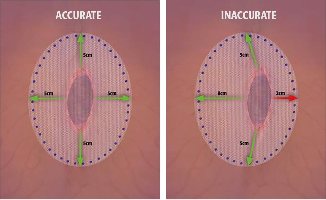 Aby zapobiec nawrotom podczas leczenia przepukliny, rozmiar siatki należy odpowiednio dostosować do rozmiaru i lokalizacji ubytku, biorąc pod uwagę wszelkie dodatkowe czynniki kliniczne dotyczące danego pacjenta. Aby uniknąć nadmiernego naprężania siatki oraz powstawania przerw pomiędzy siatką a tkanką powięzi, należy zwrócić szczególną uwagę na umiejscowienie i orientację mocowania siatki.