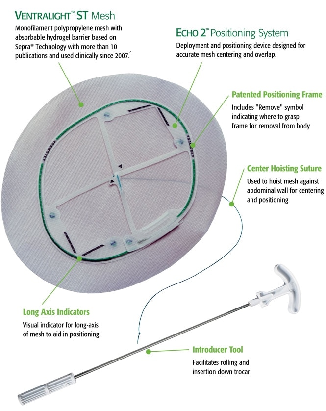 Siatka Ventralight™ ST jest wskazana do stosowania w rekonstrukcji ubytków tkanek miękkich w leczeniu przepuklin brzusznych, pooperacyjnych i pępkowych. System ustawiania Echo 2™ ma na celu ułatwianie wprowadzania i ustawiania siatki Ventralight™ ST podczas laparoskopowego leczenia przepukliny.